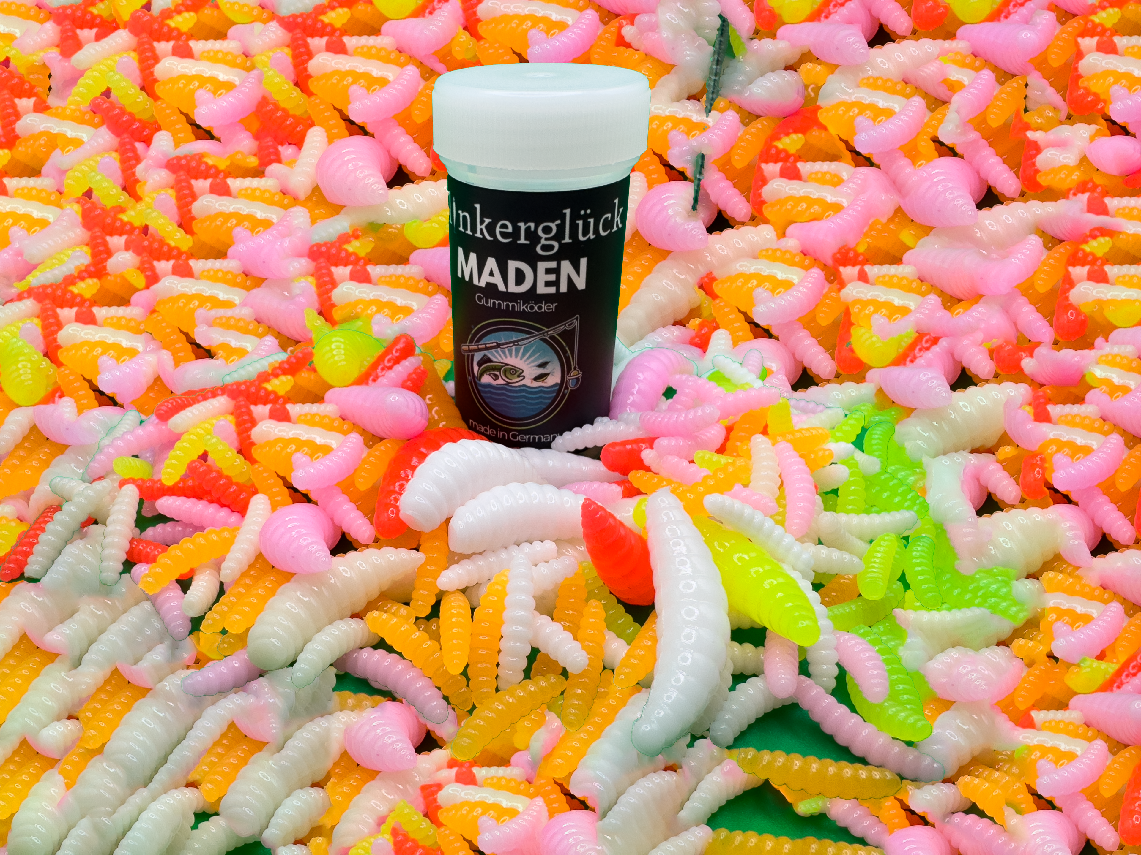 Blinkerglück Kunstmaden – handmade in Germany. Naturgetreu, weich, stabil und wahlweise mit unseren einzigartigen Aromen verfeinert – für mehr Bisse und echten Fangerfolg.